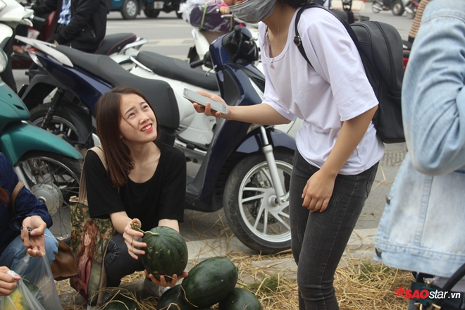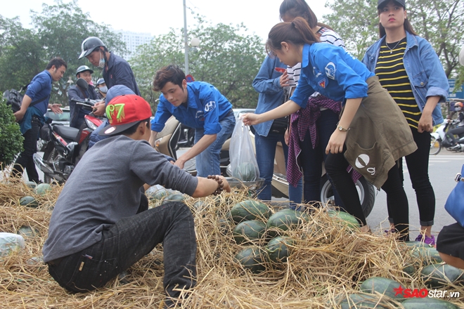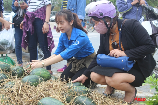 Một bạn sinh viên tình nguyện đang chọn dưa cho khách.