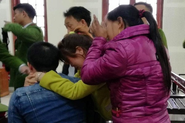 HĐXX vào nghị án, chị sợ công an nên không dám lên đứng cạnh chồng. Cho đến khi nhìn thấy chồng với đôi bàn tay bị còng và gọi tên mình, Dênh quên hết sợ hãi chạy đến ôm chầm khóc nức nở.