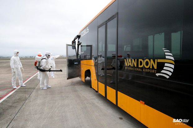 Quy trình đón khách từ tâm dịch về sân bay Vân Đồn. (Video: Thành Khương)