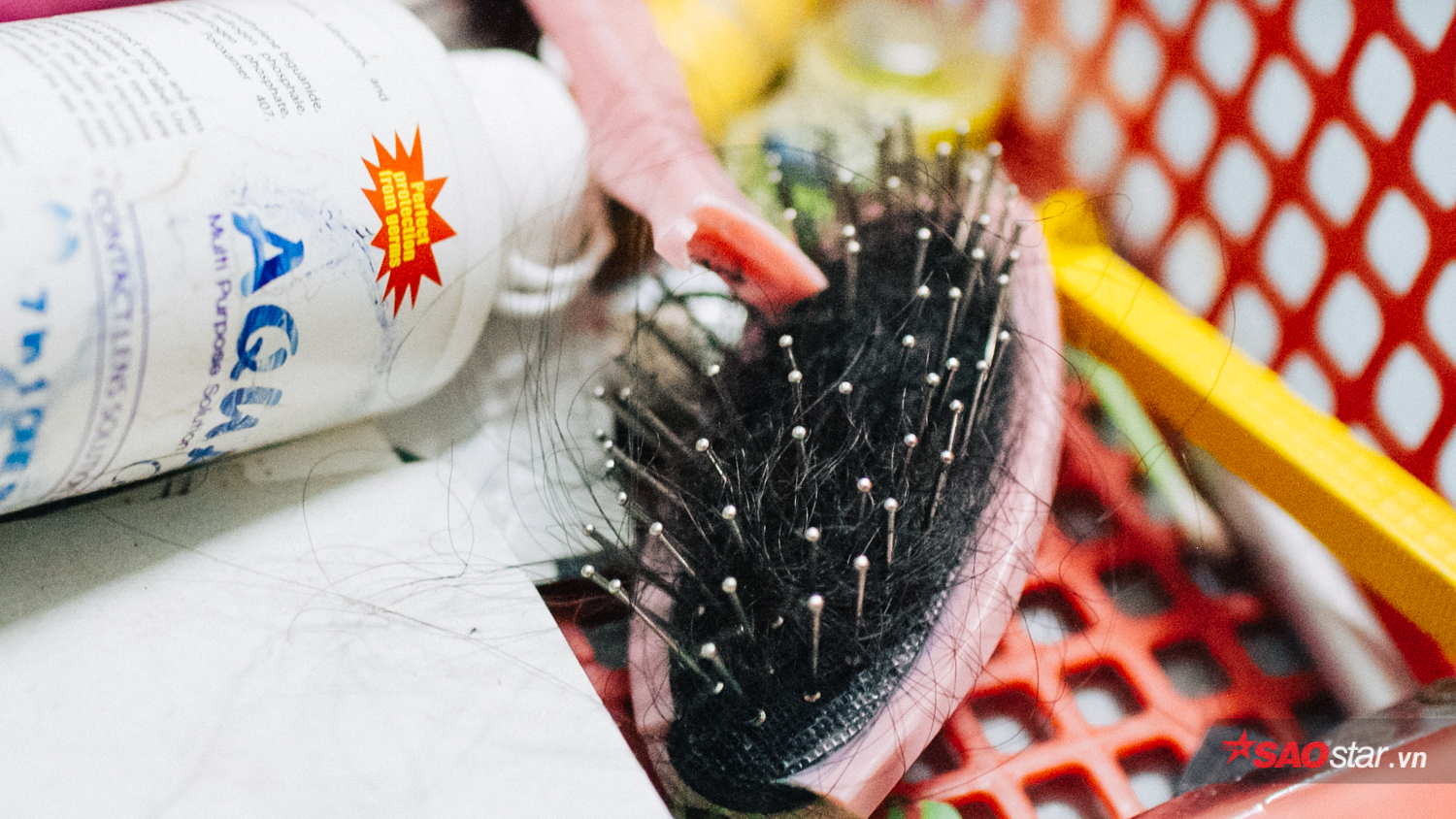 Chiếc lược bám đầy những cọng tóc giả bằng nilon đã rụng