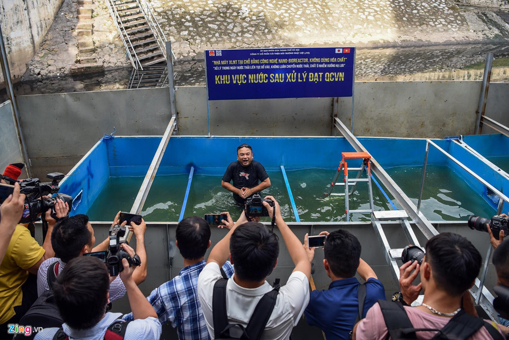 Vị chuyên gia Nhật ngụp lặn trong bể nước sông Tô Lịch sau xử lý. Ảnh: Việt Linh