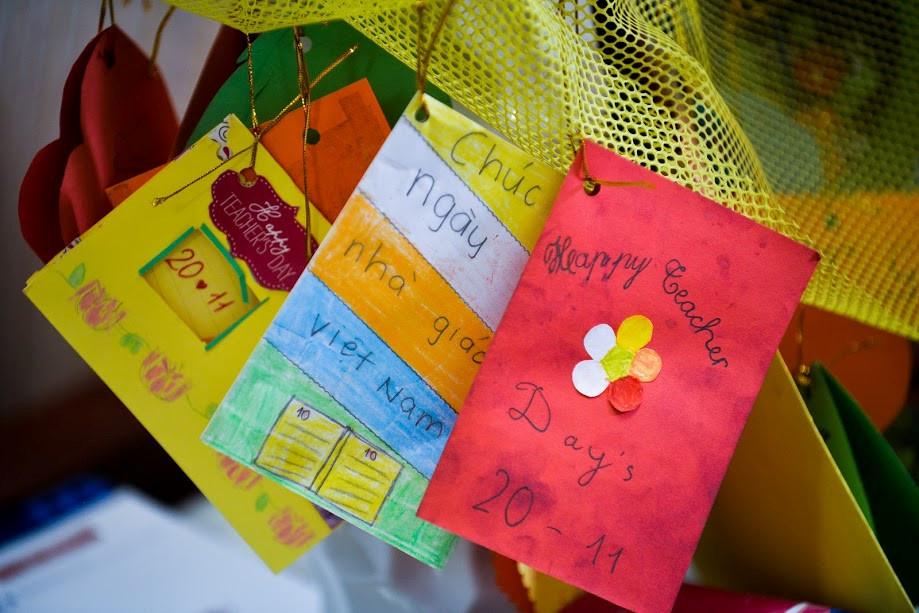 Phòng làm việc của thầy Khang không có huy chương, chỉ có những tấm thiệp học sinh viết tặng. Ảnh: Quỳnh Trang.