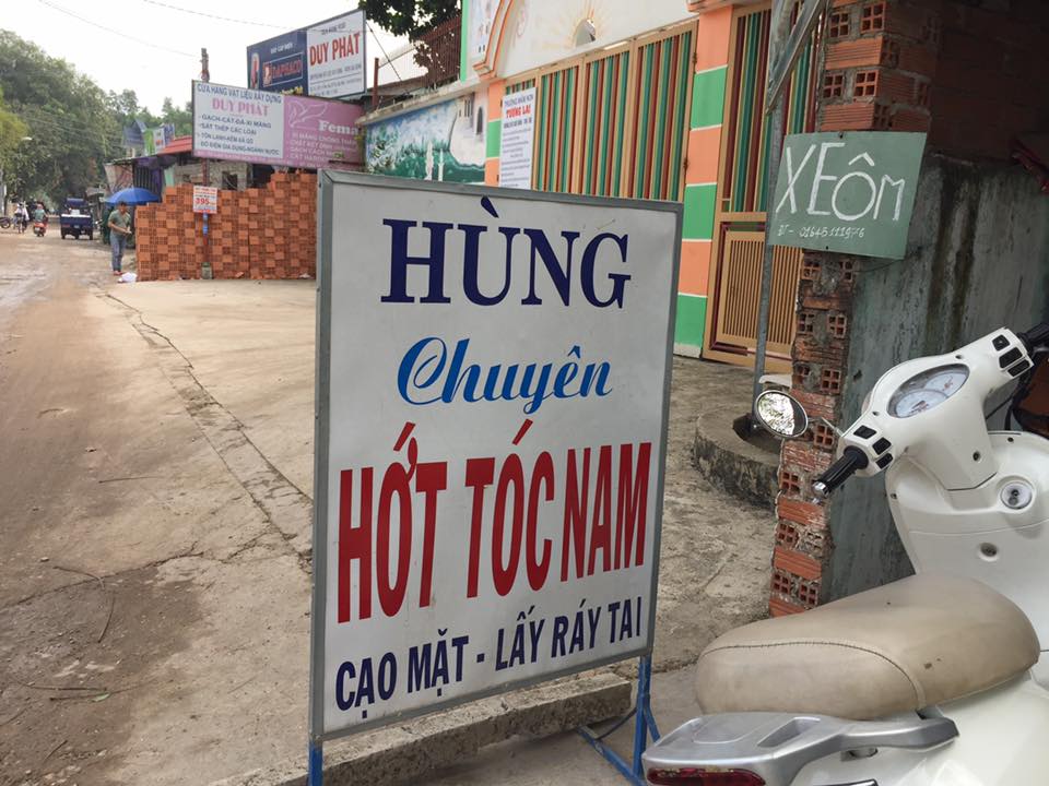 Biển hiệu cắt tóc và xe ôm được chú Hùng treo trước nhà.