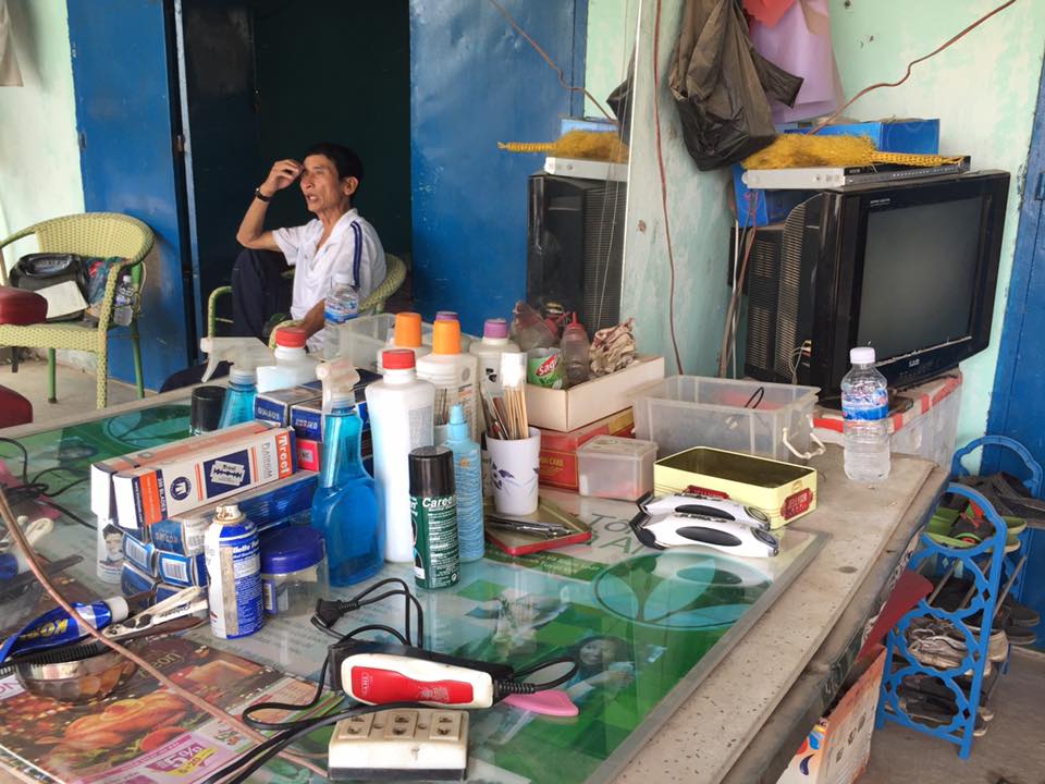 Tiệm cắt tóc đơn sơ trước cửa nhà trọ chú Hùng.