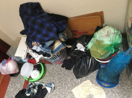 Rác chất đống bốc mùi mà không ai đổ vì những người cùng phòng “thi gan” nhau. Ảnh: Hàn Triệt.