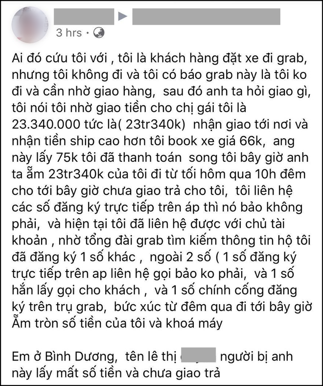 Mới đây, chị Lê Thị D. (trú tại Bình Dương) vừa chia sẻ trên trang cá nhân về việc chị bị một tài xế GrabBike lừa đảo, nhận chuyển phát số tiền hơn 23 triệu đồng nhưng sau đó lại ôm tiền bỏ trốn.