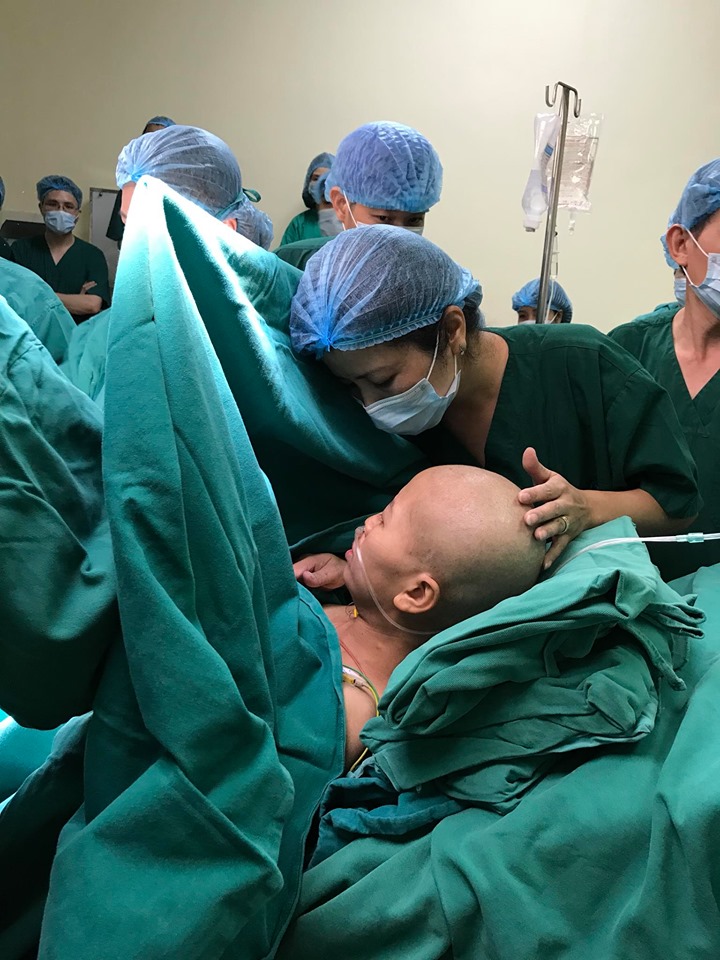 Đến chiều ngày 22/5, thai nhi ở tuần thứ 31, gần 20 bác sĩ bệnh viện K, bệnh viện Phụ sản Trung ương đã quyết định mổ bắt con cho thai phụ Liên. Ca sinh mổ hi hữu đầy khó khăn khi sản phụ phải ngồi nghiêng, cúi người để thở, giành giật từng phút giây của sự sống bằng sức lực ít ỏi cuối cùng với niềm mong mỏi được đón con chào đời.