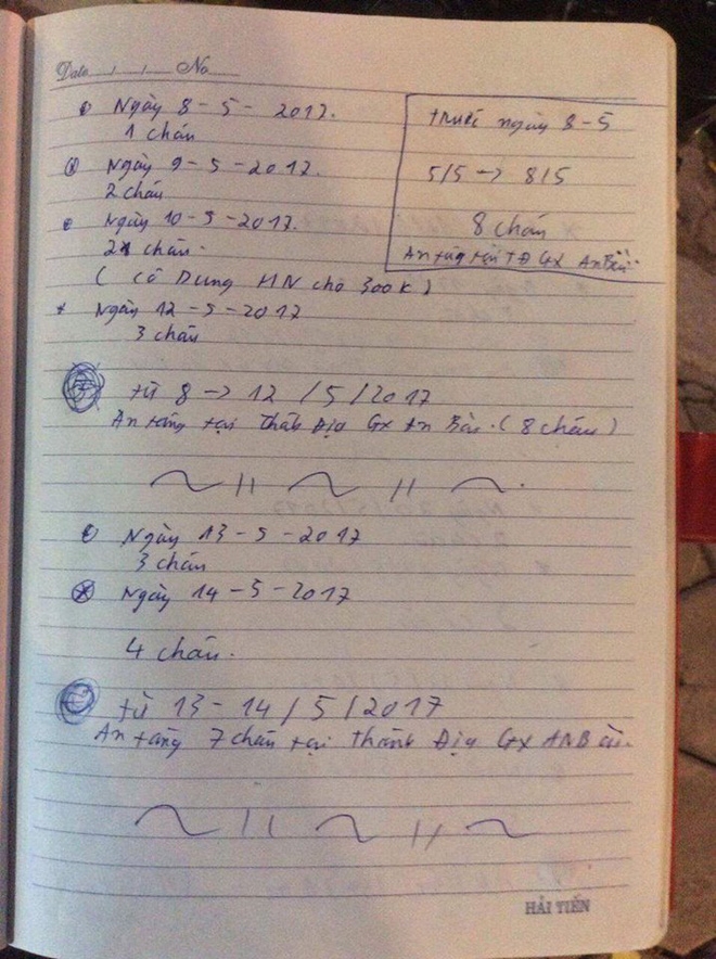 Cuốn sổ nhật ký ghi chép số hài nhi A. và nhóm tình nguyện viên nhận về.