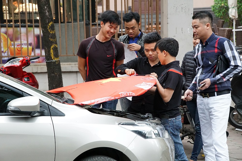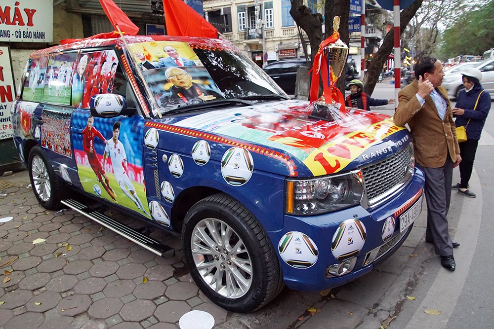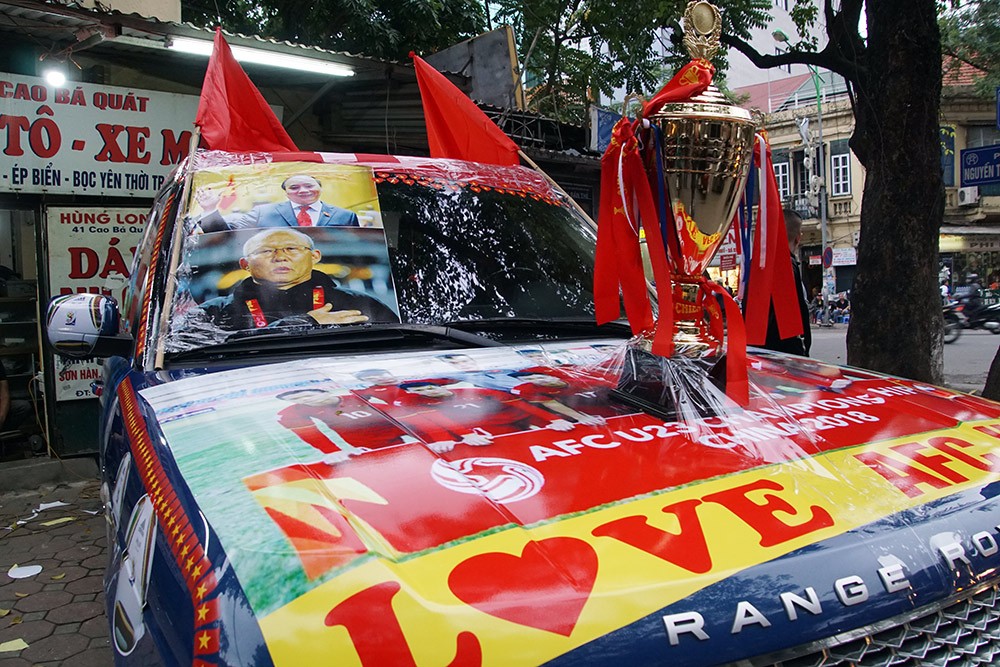 Một trong số những trường hợp như thế là anh Nguyễn Đại Dương (Nguyễn Chí Thanh, Hà Nội). Chiếc xe bạc tỷ của anh Dương được dán đầy hình ảnh thầy trò HLV Park Hang Seo, phần mui xe còn gắn cả biểu tượng chiếc cúp vàng với hy vọng, đội nhà sẽ giành ngôi vô địch.