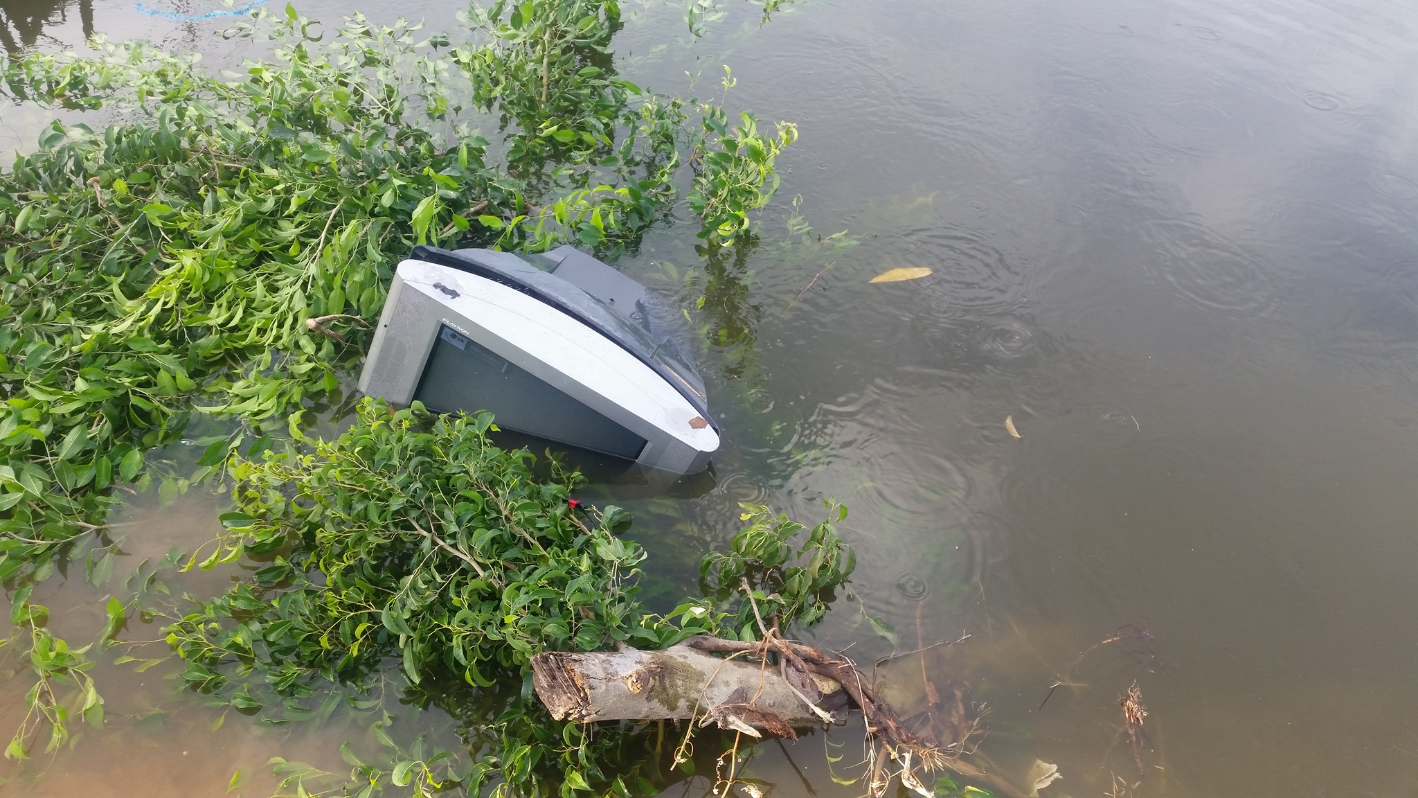 Chiếc tivi bị vứt xuống hồ nước không thương tiếc.