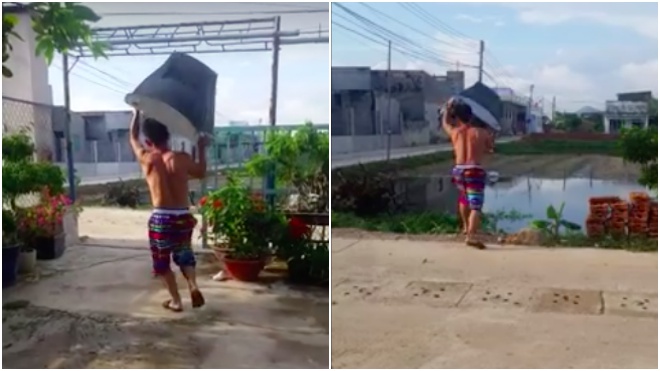 Clip người đàn ông ném thẳng tivi xuống hồ nước. Nguồn: facebook N.C.H