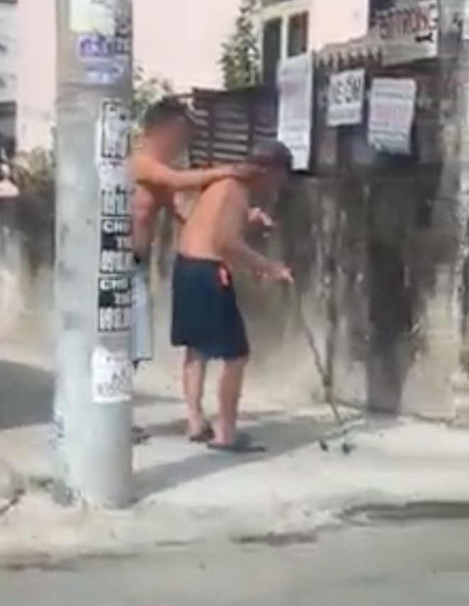 Không những có hành động kéo tay cụ ông cho đi nhanh hơn, người này sau đó bất ngờ sút mạnh vào chân của cụ ông. Cú đạp mạnh khiến cụ ông chới với suýt ngã ngửa ra đằng sau, phải bám vịn vào người đàn ông và chiếc gậy để đứng lên và đi vào nhà.