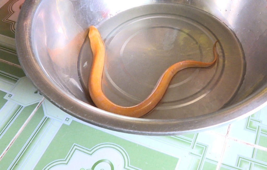 Con lươn toàn thân có màu vàng óng. (Ảnh: Thanh Lâm).