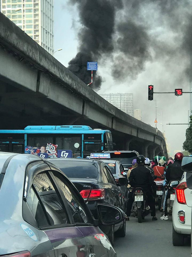 Khói đen bốc nghi ngút từ hiện trường xe ô tô bốc cháy ở đường vành đai 3 trên cao.
