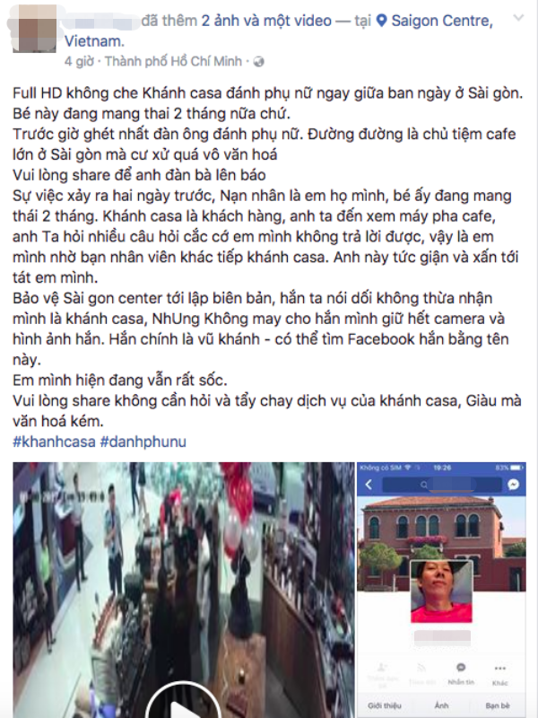 “Sự việc xảy ra hai ngày trước. Nạn nhân là em họ mình, bé ấy đang mang thai 2 tháng. Khánh Casa là khách hàng, anh ta đến xem máy pha cafe. Anh ta hỏi nhiều câu hỏi cắc cớ em mình không trả lời được, vậy là em mình nhờ bạn nhân viên khác tiếp Khánh casa. Anh này tức giận và xấn tới tát em mình.