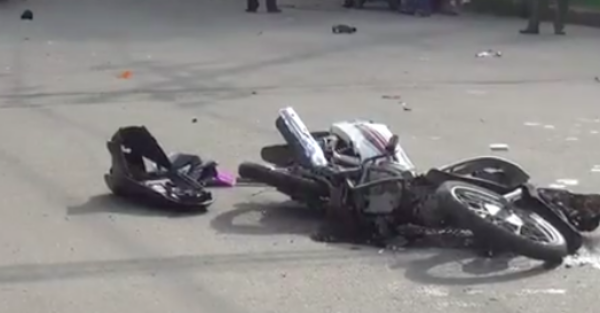 Chiếc xe máy bị hất văng, biến dạng. Ảnh chụp màn hình