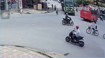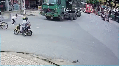 Tuy nhiên, khi chiếc xe đạp gần ra giữa đường thì xe tải đi tới, tông trúng 2 bé trai. Bé trai ngồi sau kịp thời bỏ chạy, còn bé ngồi trước bị cuốn vào gầm cùng chiếc xe đạp.