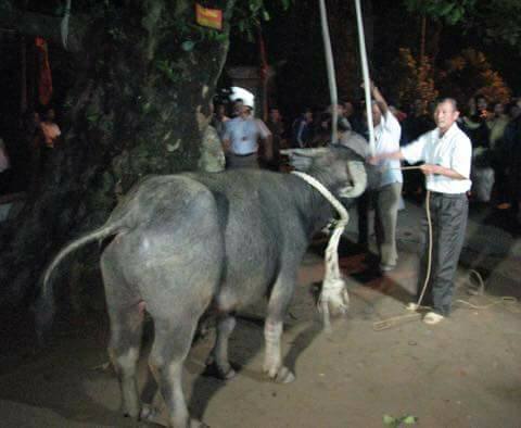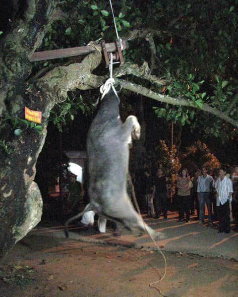 Trong những ngày lễ hội, đây là một trong những nghi lễ được nhiều người dân mong chờ nhất. Theo như clip, con trâu tế sau khi được buộc dây thừng và đưa đến gốc cây, sau tiếng hiệu lệnh, lập tức sẽ có nhiều người cùng góp sức kéo chú trâu treo lơ lửng trên cây cho đến khi chết.