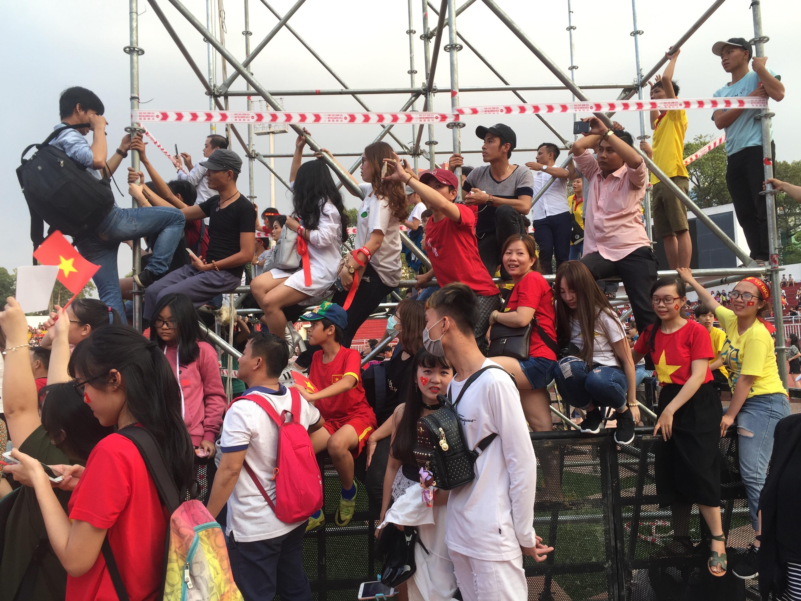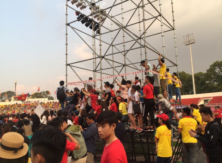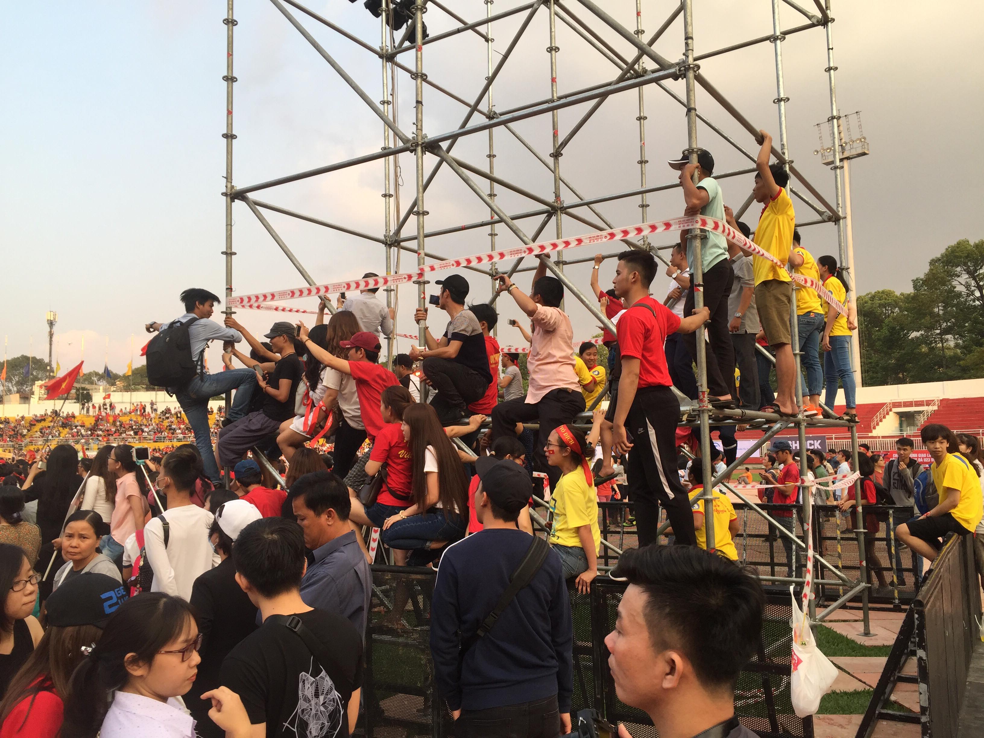 Không chỉ có các cổ động viên nam, các cổ động viên nữ cũng bất chấp trèo lên giàn giáo.