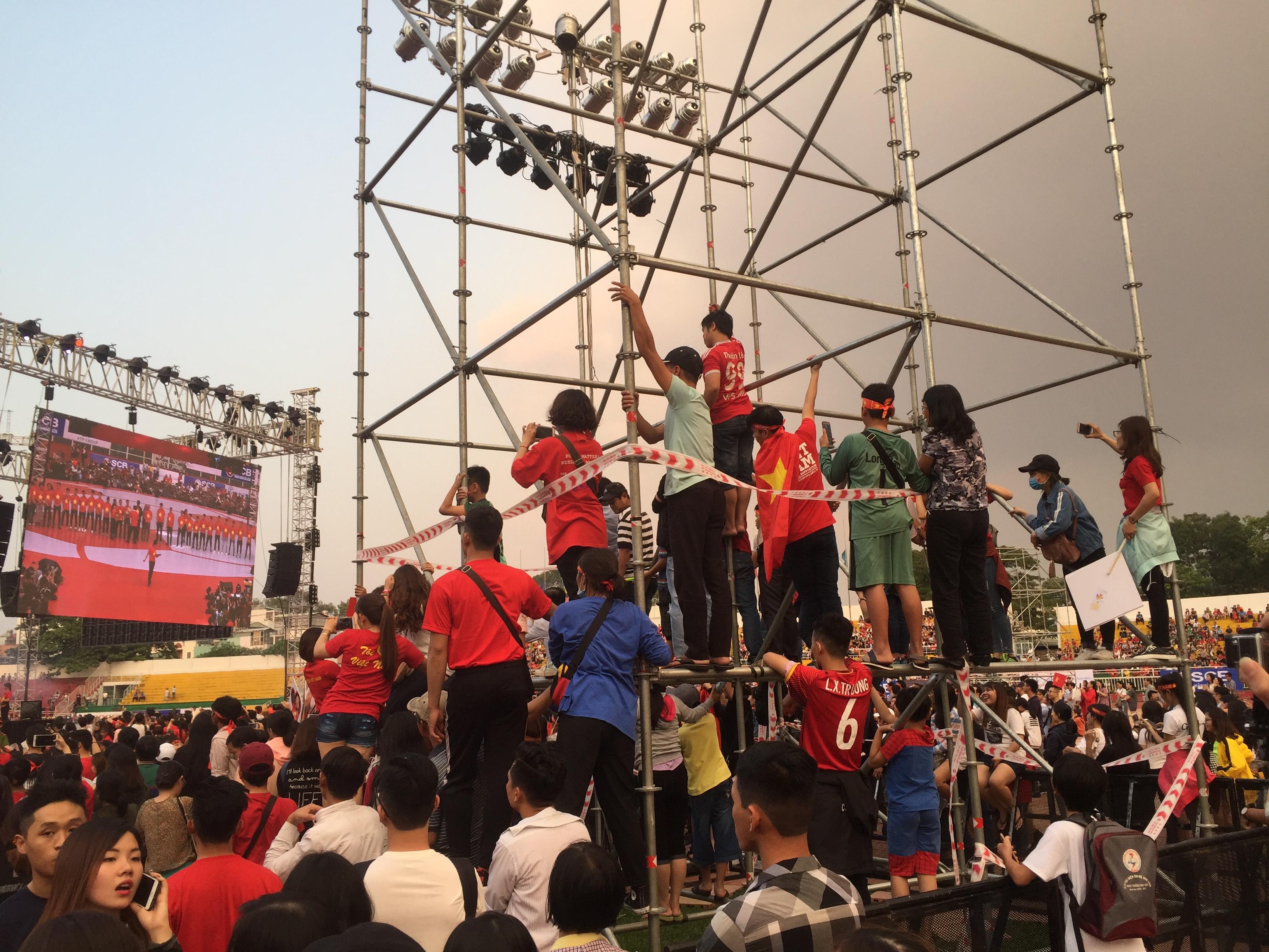 Ở những vị trí xa sân khấu, người hâm mộ đã trèo lên giàn giáo để theo dõi các cầu thủ.