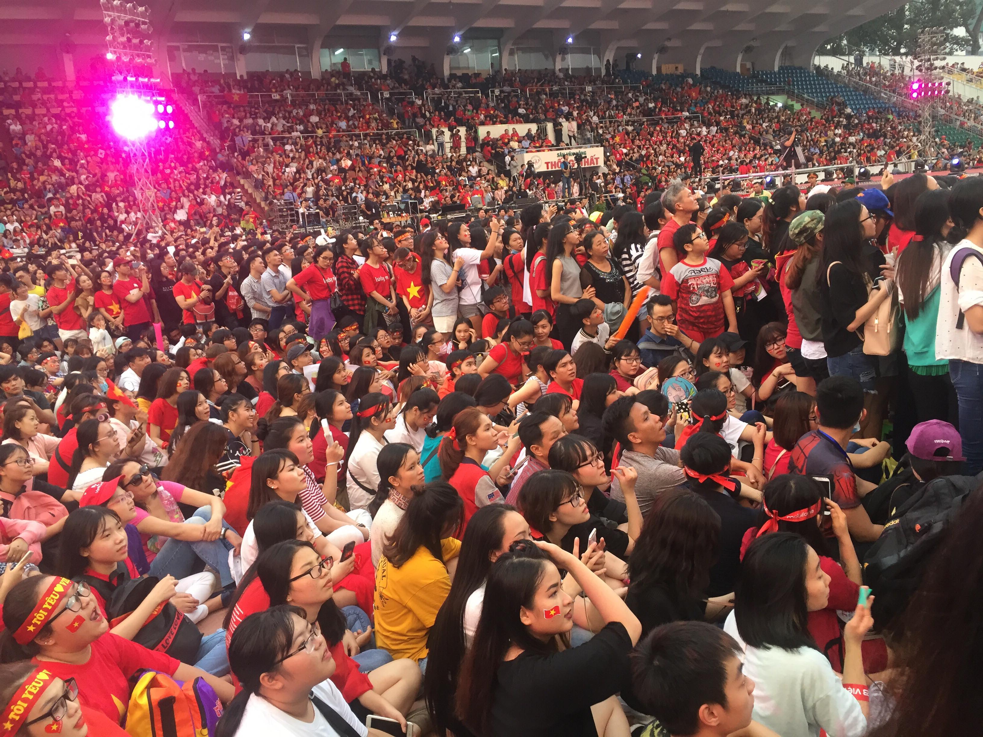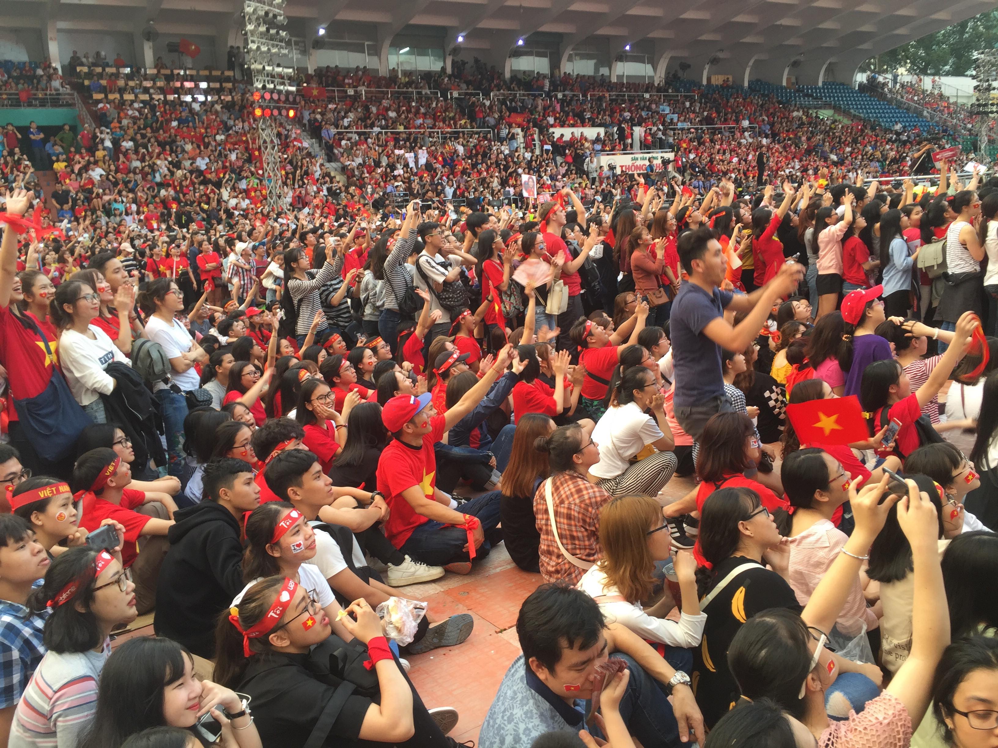 Khắp khán đài, rực rỡ màu áo, màu cờ. Tiếng la hò, reo mừng rất nhộn nhịp, hào hứng.