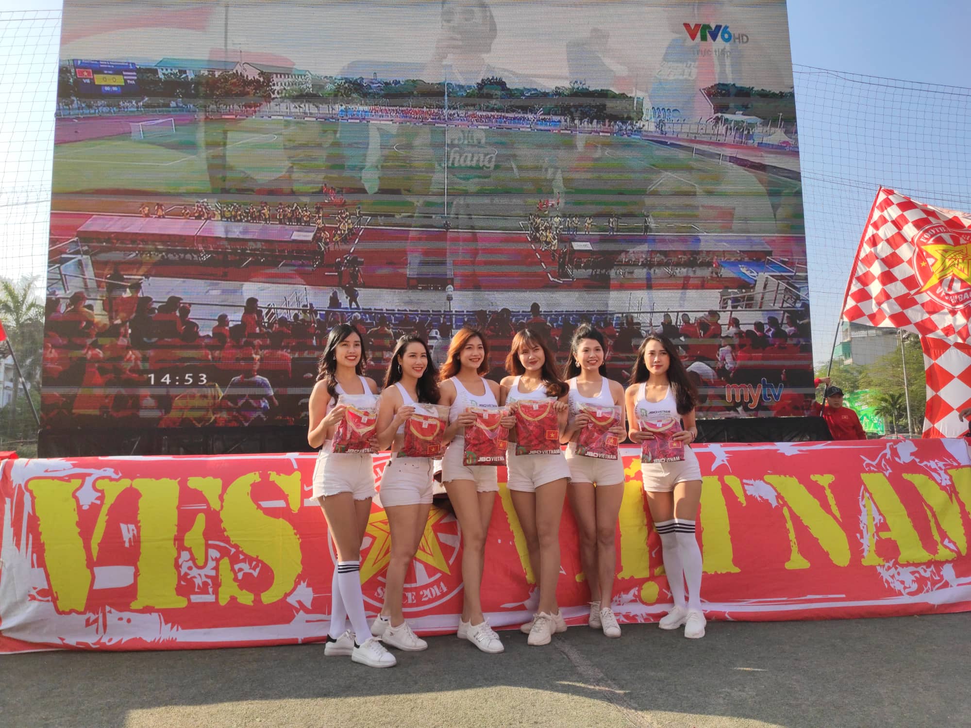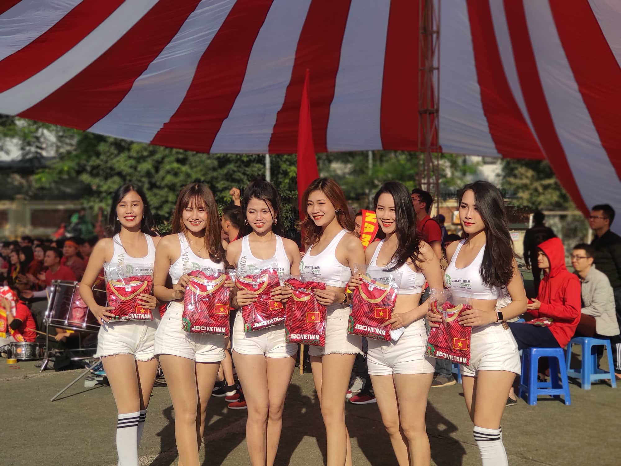 Nhiều cổ động viên nữ sinh đẹp phát áo cho người hâm mộ.