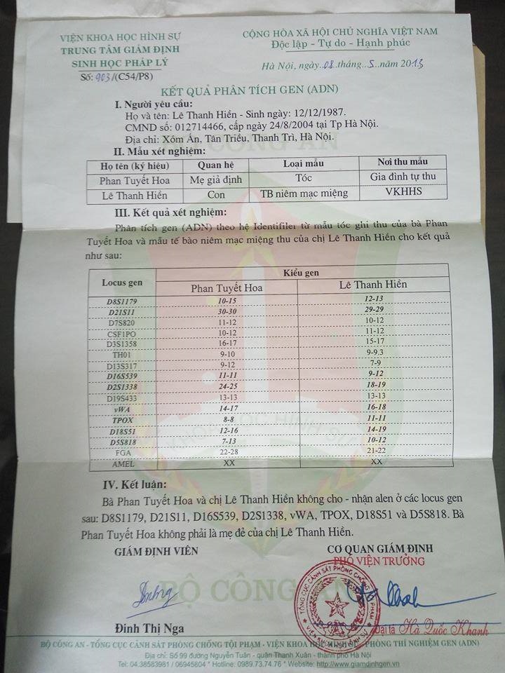 Phiếu xét nghiệm chị Hiền và bà Hoa không cùng huyết thống.