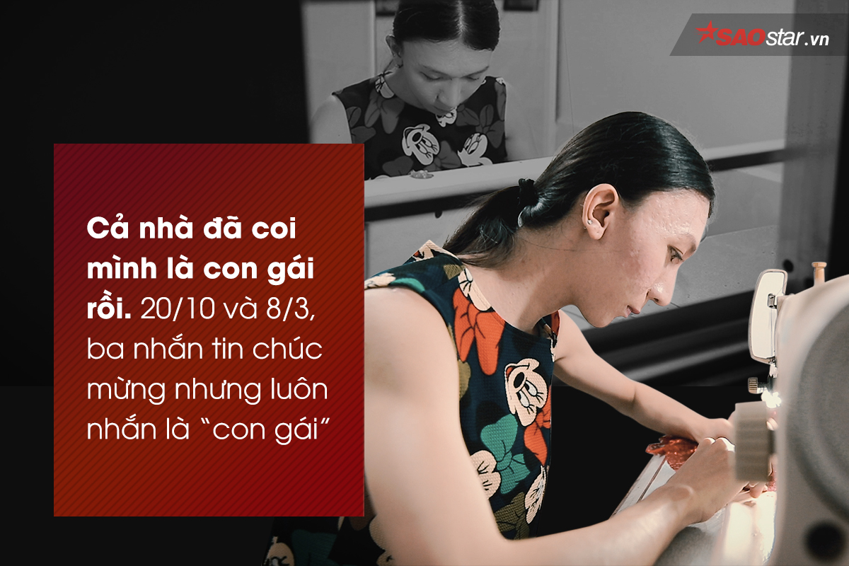 “Ngoài công việc chính ở xưởng may, mình còn là một dancer và thỉnh thoảng tham gia trình diễn thời trang cho các show chuyển giới. Chuyên nghiệp hơn chắc là các show diễn cho đồ án tốt nghiệp của các bạn sinh viên trường ĐH Hồng Bàng. Cũng có bạn bè rủ mình casting cho Vietnam International Fashion Week (VNIFW) nhưng mình không đủ tự tin”.