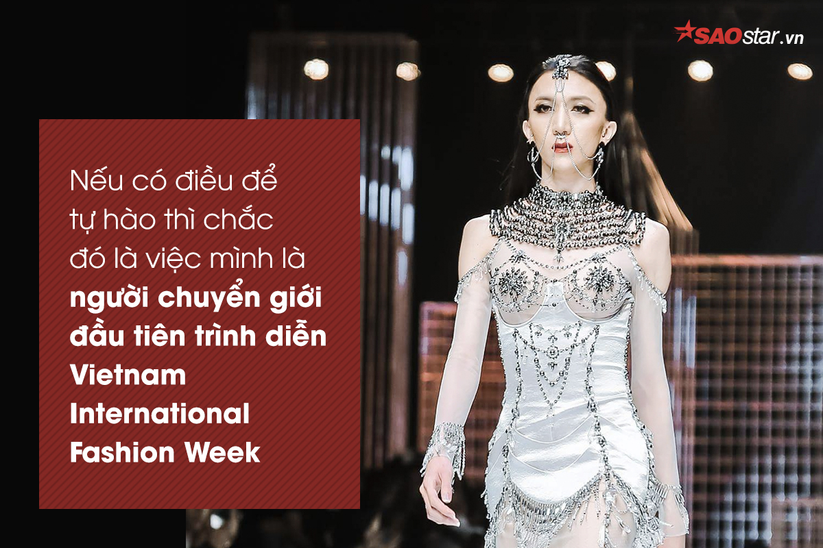 “Nếu có điều để tự hào thì chắc đó là việc mình là người chuyển giới đầu tiên trình diễn Vietnam International Fashion Week (ngoài ra chương trình cũng có 1 bạn chuyển giới khác nhưng diễn hôm sau mình). Với người mẫu thì đây là cơ hội tuyệt vời để tỏa sáng, còn với mình đây là cảm giác hạnh phúc mà đến giờ nhắc lại vẫn còn thấy lâng lâng”.