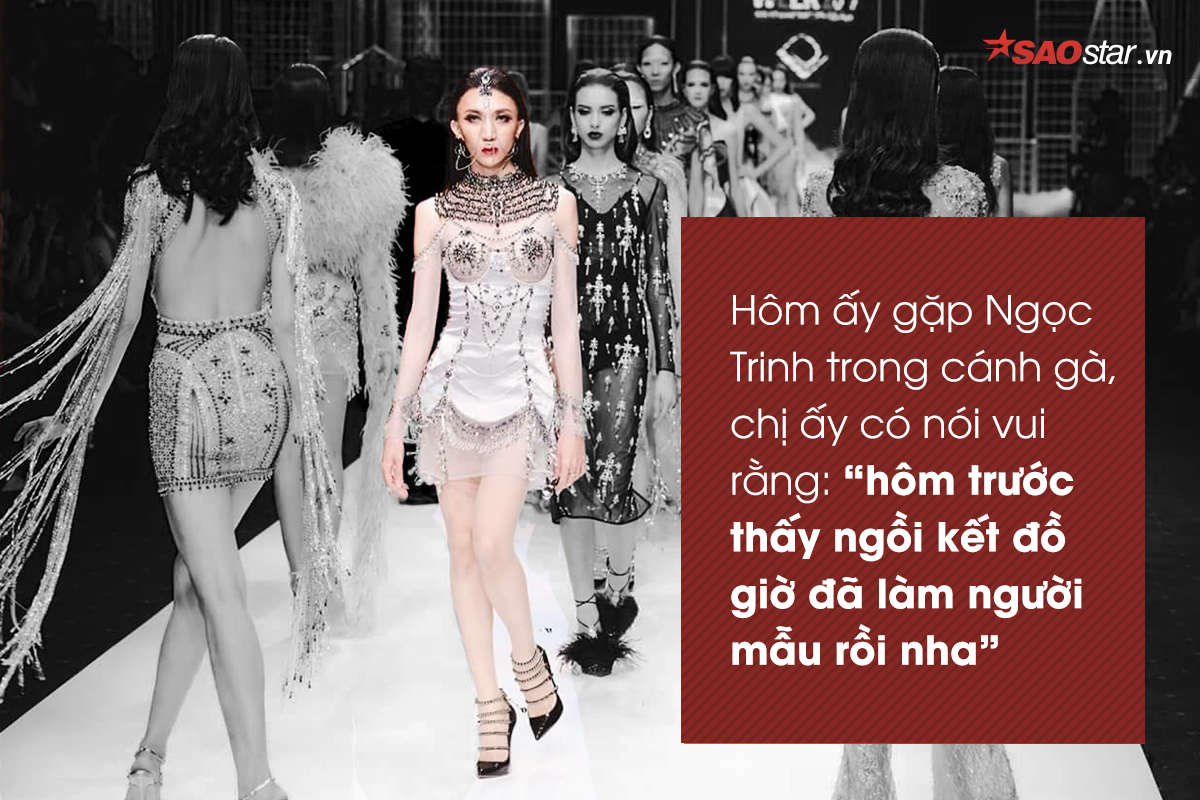 Hôm sát ngày diễn mình tăng ca làm cho xong bộ đồ vedette (được Hoa hậu Kỳ Duyên mặc) đến tận 4g30 sáng. Mình ngủ được 2 tiếng rồi phải tức tốc chạy đến nơi để tổng duyệt chương trình. Nhiều bạn người mẫu quen trước đó thậm chí còn ngạc nhiên hỏi: “Em chạy chương trình thế ai vậy”. Mãi cho đến khi mặc đồ, trang điểm và bước ra sàn diễn mình mới dám tin cơ hội tuyệt vời này đã đến với mình”.