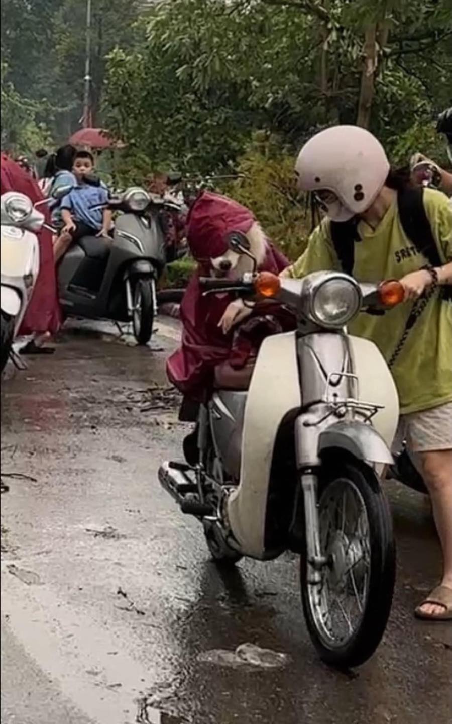 Tuy nhiên, tất cả đều phải ngã ngửa vì bất ngờ khi biết chính xác danh tính "em nhỏ" ngồi sau xe của cô gái này. Hoá ra, "em nhỏ" được cô gái cẩn thận bảo vệ ấy là một... chú chó. Vì quá yêu thương chú chó nhỏ của mình, cô gái đã nhường áo mưa và dắt bộ xe để đảm bảo an toàn cho chú chó.