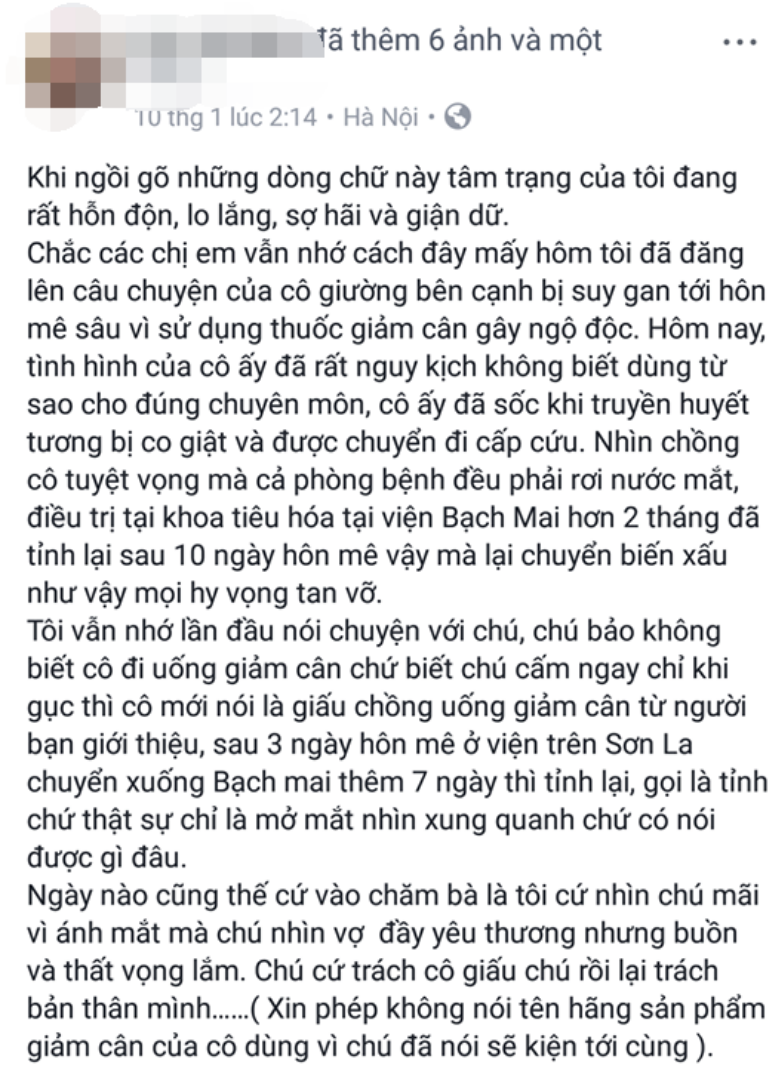Theo đó, trang facebook cá nhân có tên K.A.B chia sẻ thông tin, chị tình cờ biết được câu chuyện khi vào viện chăm sóc người thân. Chứng kiến câu chuyện người chồng vất vả chăm vợ, K.A.B muốn chia sẻ để cảnh báo mọi người về tác hại của thuốc giảm cân.