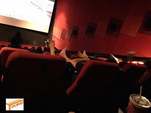 Cô gái mặc quần ngắn thản nhiên gác chân lên ghế trong rạp chiếu phim.