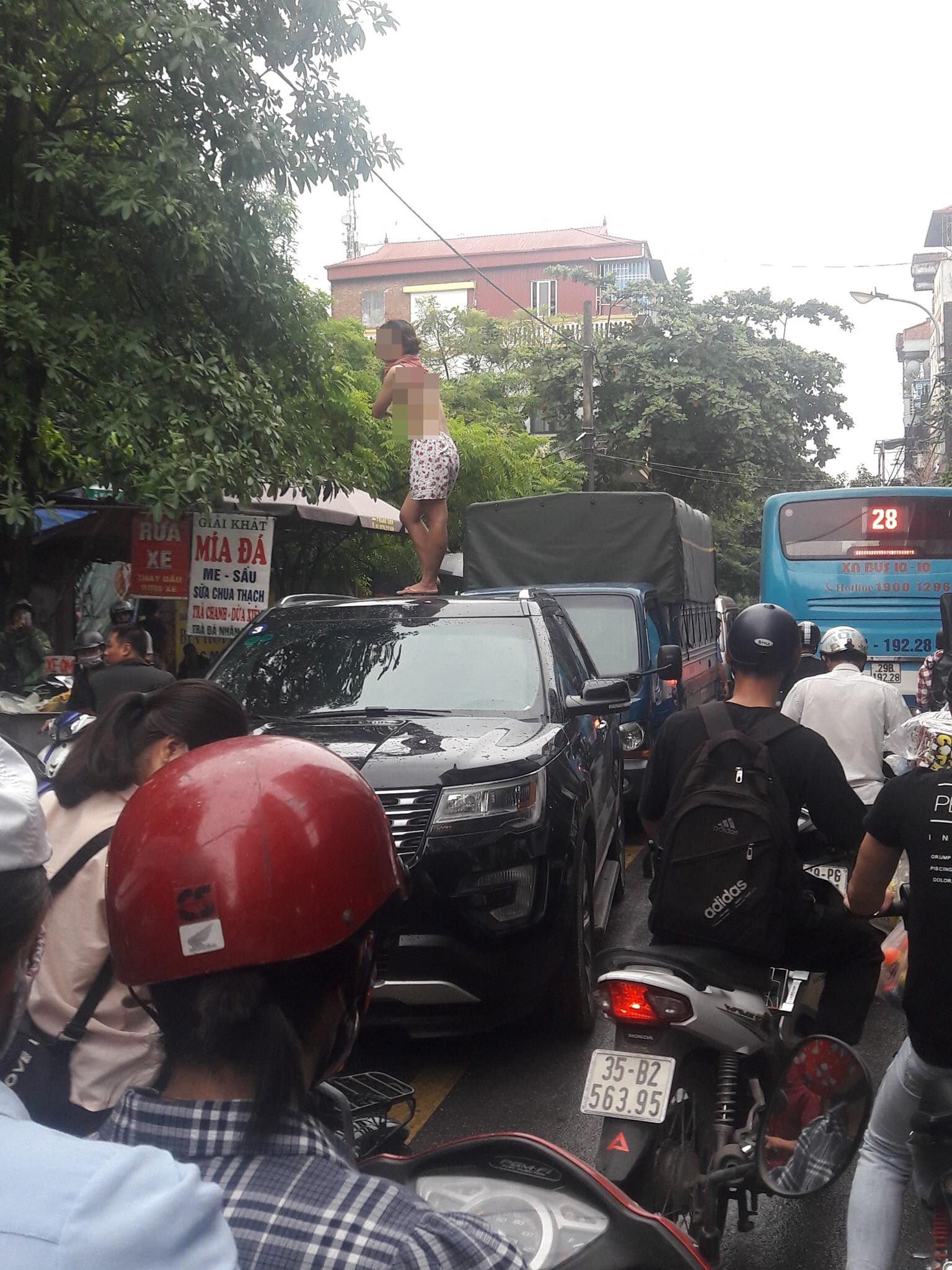 Khoảng 11h ngày 3/10, nhiều người lưu thông trên phố Trần Cung, đoạn gần cây xăng, hướng đi từ đường Hoàng Quốc Việt đến đường Phạm Văn Đồng (phường Cổ Nhuế 1, Bắc Từ Liêm, Hà Nội) phát hiện cô gái leo lên nóc ô tô 7 chỗ màu đen hiệu Ford đang dừng giữa lòng đường la hét, nhảy múa với biểu hiện như ngáo đá.