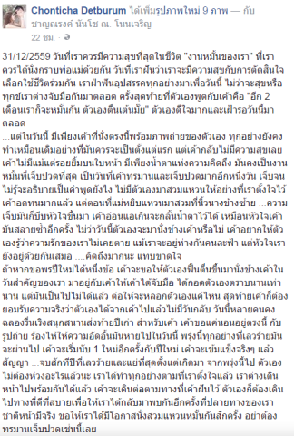 Những dòng chia sẻ trên trang cá nhân của Chonticha sau lễ đính hôn với người chồng quá cố chỉ trong vài giờ đồng hồ đã có sức lan toả vô cùng lớn tại Thái Lan. Cô chia sẻ về cuộc tình của mình, về niềm hạnh phúc trông chờ đến ngày đính hôn và về việc mình đã sống thế nào sau biến cố vô cùng đau đớn ấy.