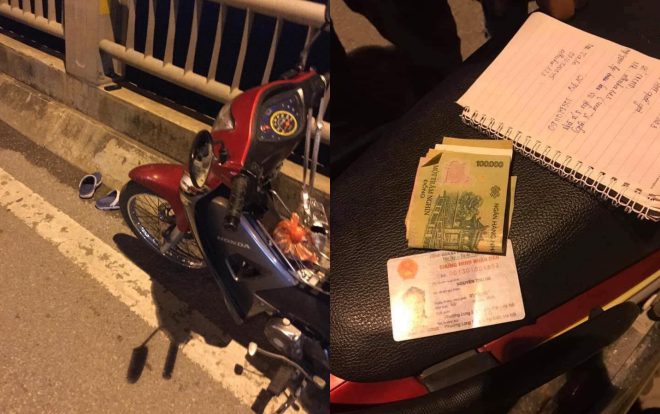 Xe máy, đôi dép cùng tài sản cô gái để lại trên cầu.