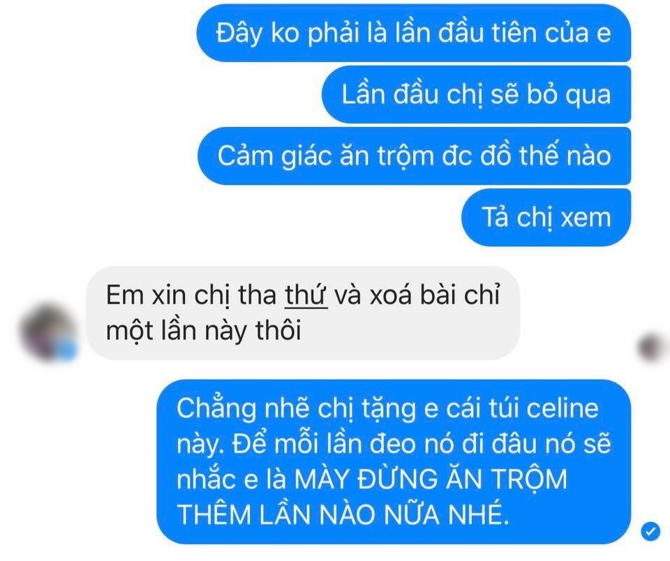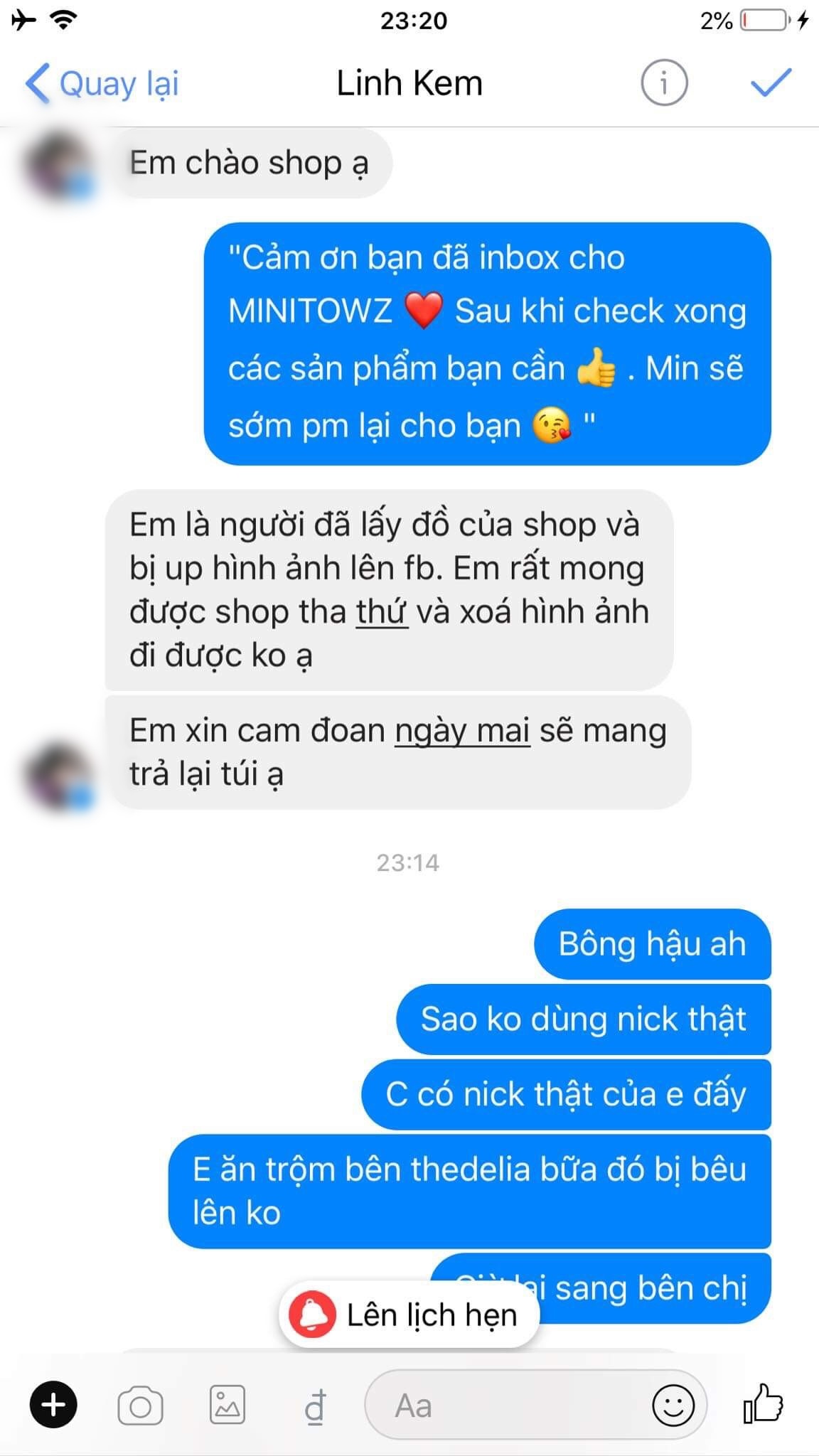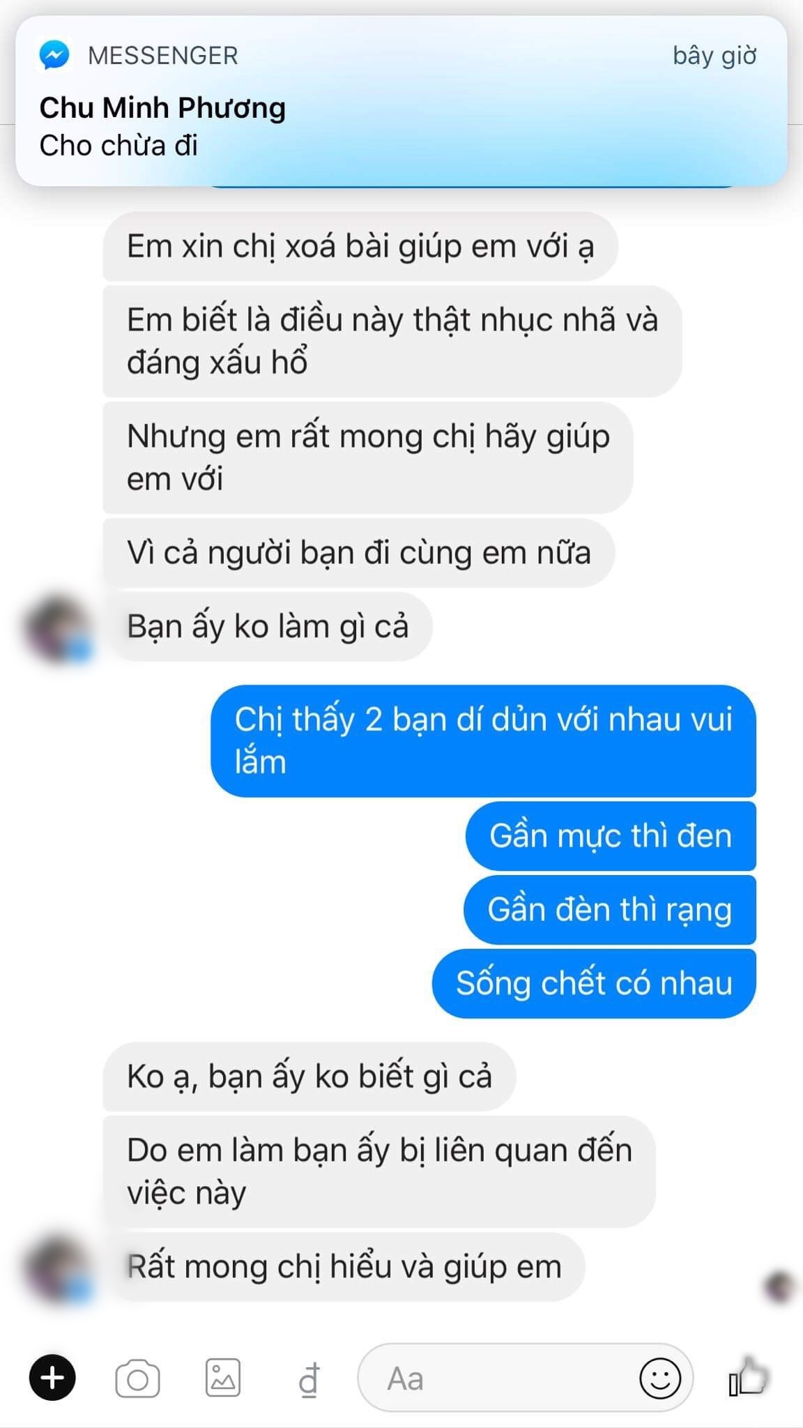 “Em là người lấy cắp đồ và bị up hình lên facebook. Em xin chị tha thứ và xoá bài chỉ 1 lần này thôi. Để bài hết hôm nay em thực sự không tưởng tượng được sẽ như thế nào nữa. Em xin cam đoan ngày mai sẽ mang trả lại túi ạ.