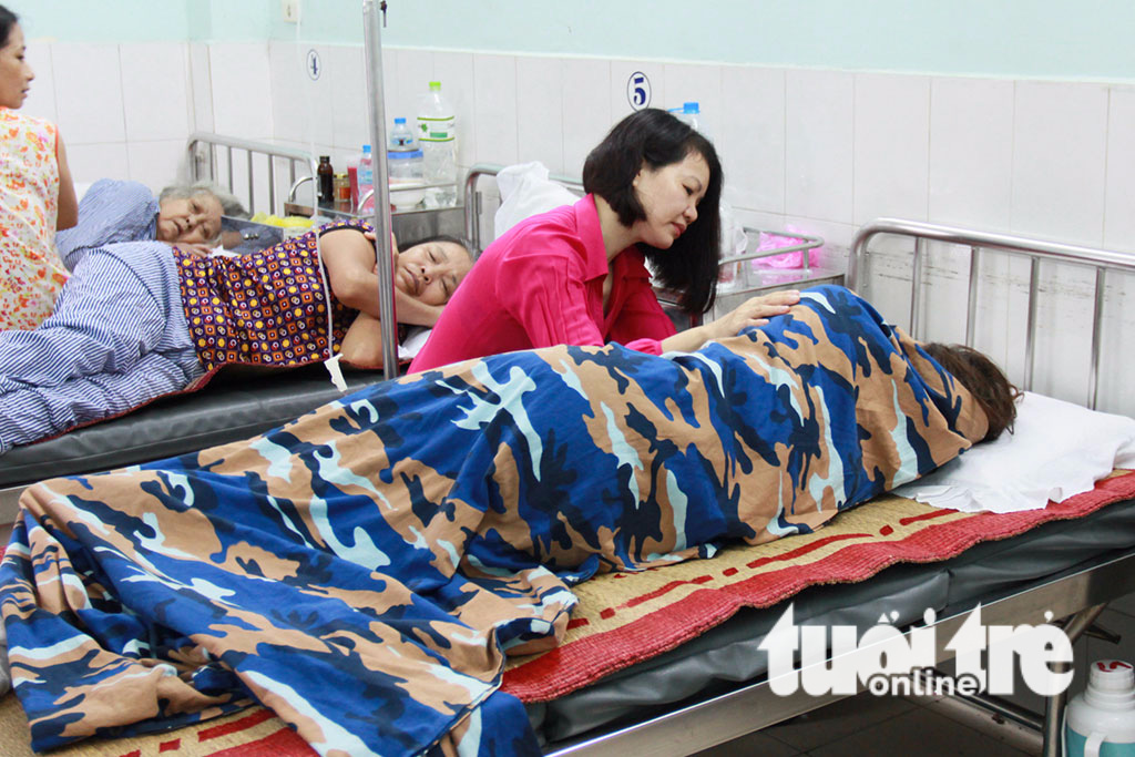 Một phụ huynh học sinh nghe tin đến bệnh viện thăm hỏi, động viên cô Th. sau sự việc - Ảnh: TIẾN THẮNG