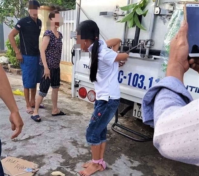 Trước đó, vào khoảng 17 giờ chiều 29/5, người dân đi trên Quốc lộ 1 đoạn qua thôn 10 phát hiện một bé gái bị trói hai tay vào thùng xe tải đậu ngay bên lề đường trong trạng thái sợ sệt và xấu hổ. Ngay cạnh vị trí bé gái bị trói là một tấm bảng bằng giấy bìa cứng có chữ “phạt trộm” ghi bằng bút mực khá lớn.