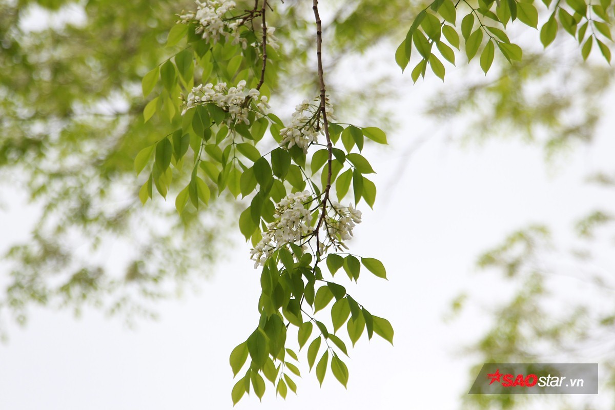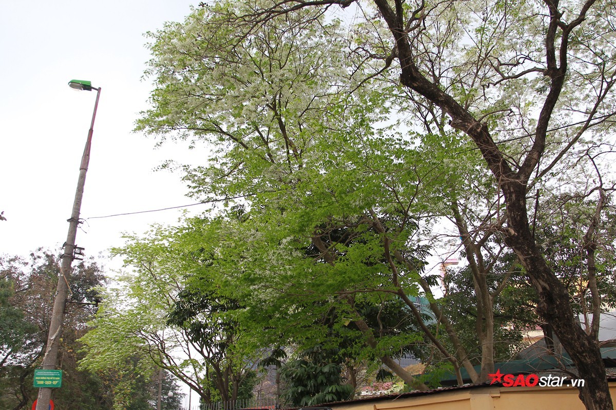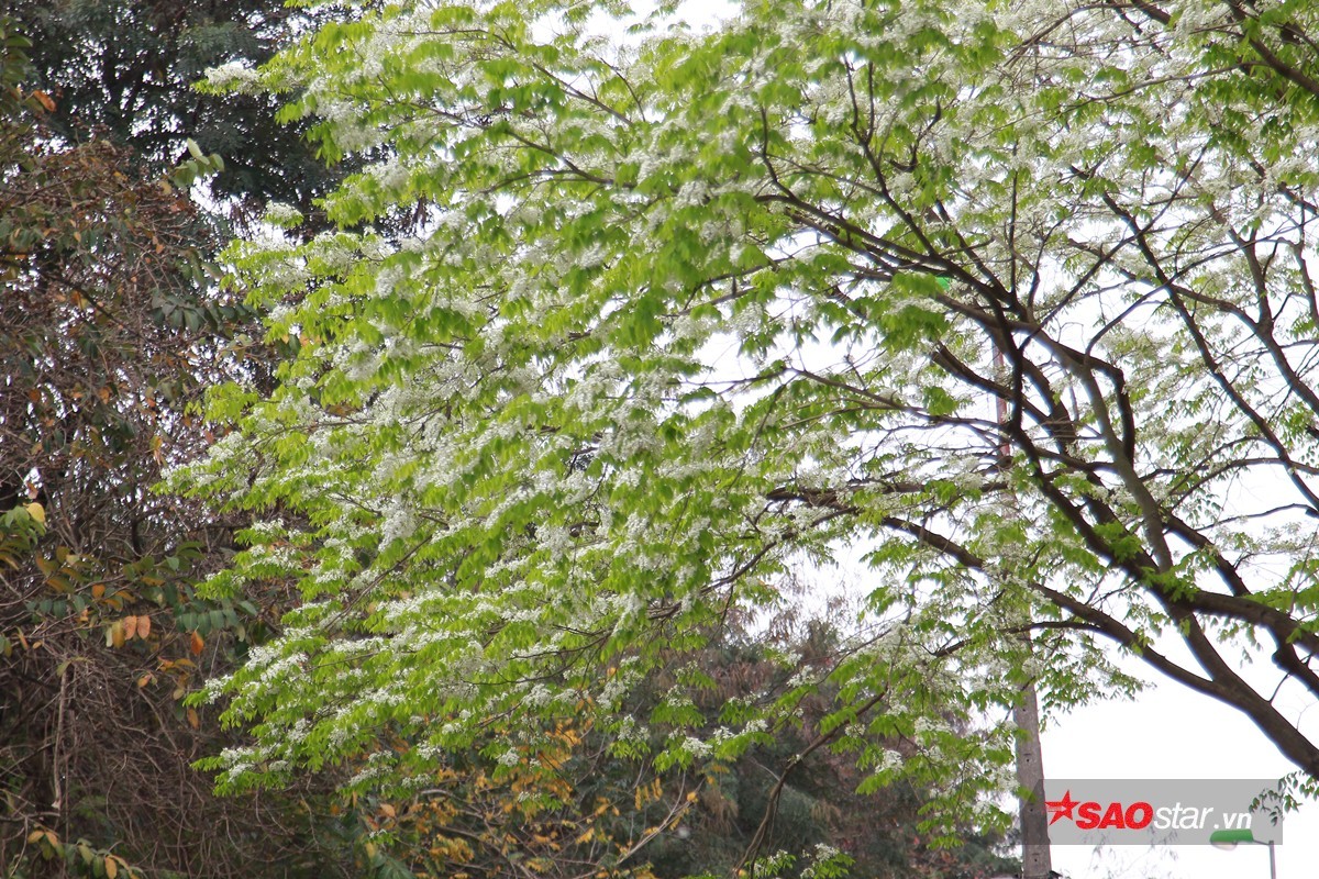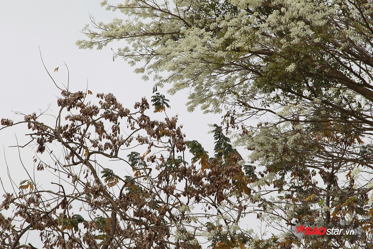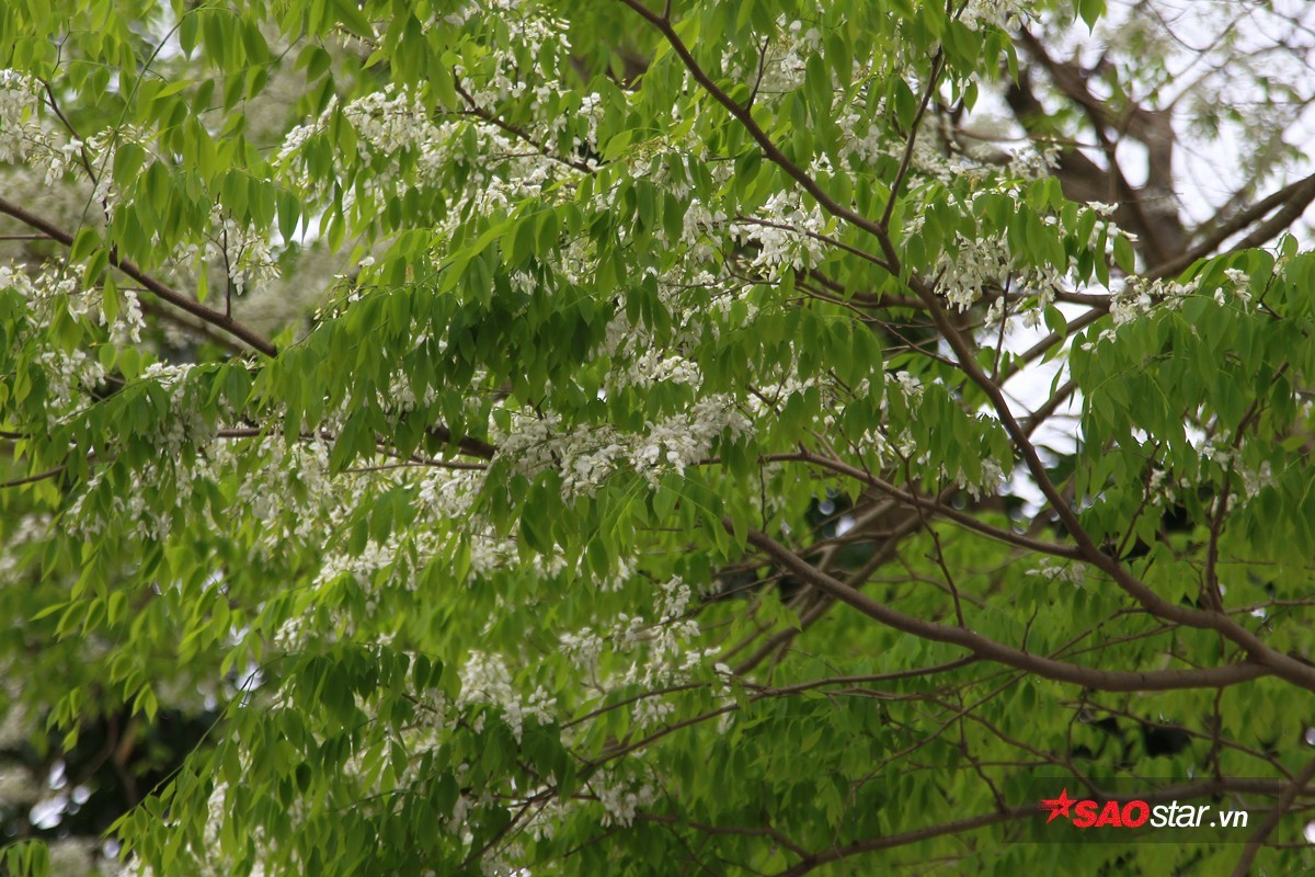 Những cây sưa lá xanh non mơn mởn, chỉ còn nhìn thấy màu trắng của hoa nở.