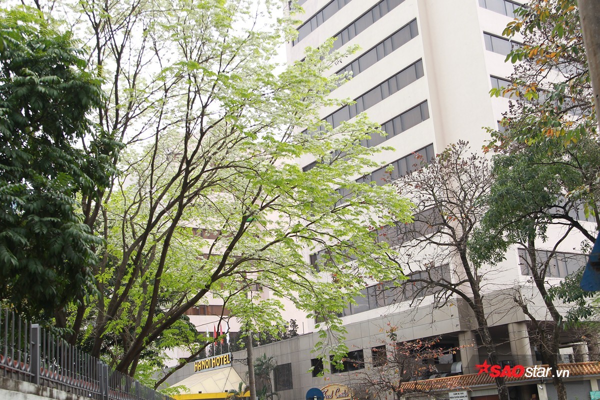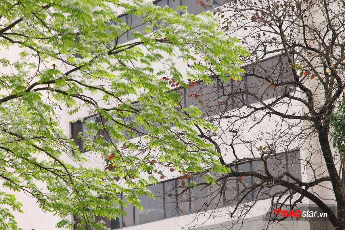 Màu trắng xen lẫn xanh non của cây sưa đan xen với các loại cây đang mùa thay lá tạo nên mảng màu đối lập trên đường phố.