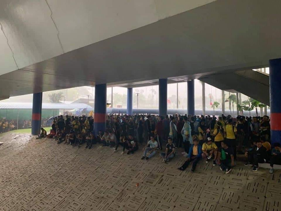 Mưa bắt đầu lớn hơn, nhiều CĐV đã phải tìm chỗ trú thay vì cầm ô đứng ngoài SVĐ. Ảnh: Trắng TV