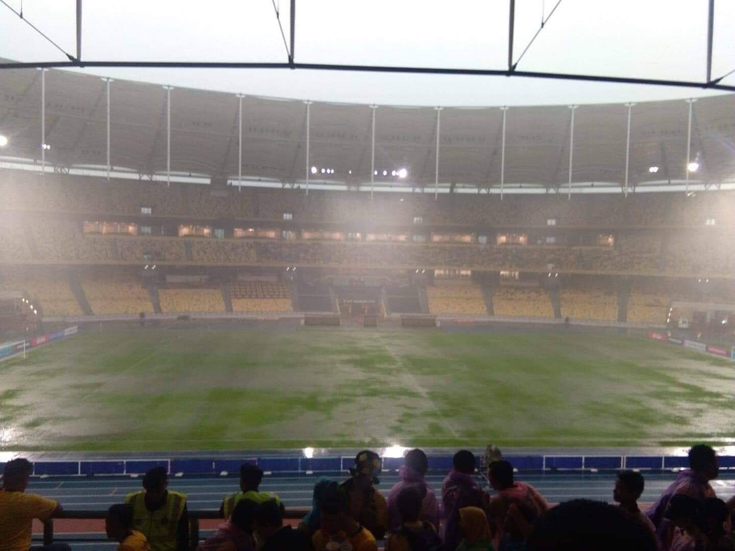 Cơn mưa lớn tại sân Bukit Jalil lúc hơn 15h chiều (giờ Việt Nam). Ảnh: Trắng TV