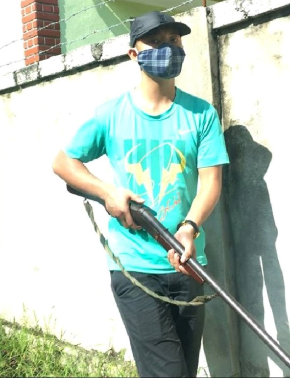 Một tên trong nhóm côn đồ bịt mặt, dùng súng hoa cải tấn công người khác. Ảnh: Cắt từ clip.
