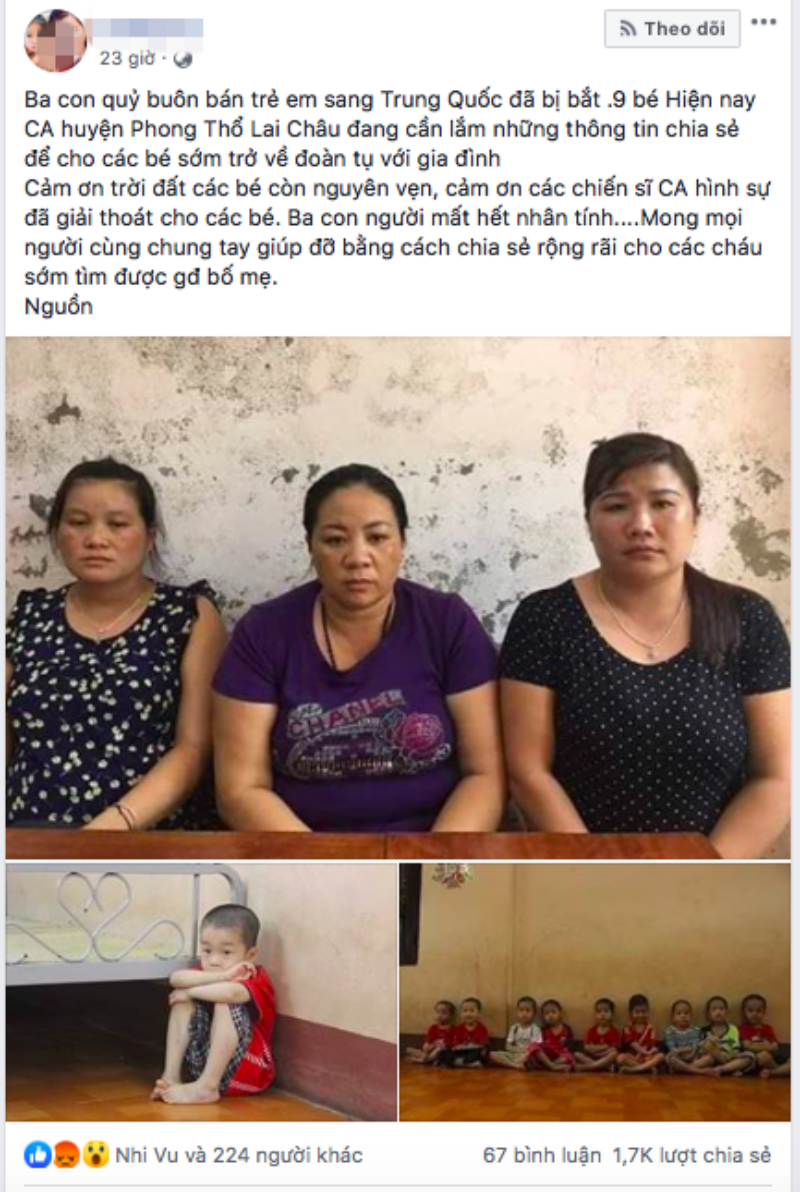 Theo đó, bài viết đăng tải với nội dung: “Ba con quỷ buôn bán trẻ em sang Trung Quốc đã bị bắt. 9 bé. Hiện nay CA huyện Phong Thổ Lai Châu đang cần lắm những thông tin chia sẻ để cho các bé sớm trở về đoàn tụ với gia đình. Cảm ơn trời đất các bé còn nguyên vẹn, cảm ơn các chiến sĩ công an hình sự đã giải thoát cho các bé. Ba con người mất hết nhân tính…. Mong mọi người cùng chung tay giúp đỡ bằng cách chia sẻ rộng rãi cho các cháu sớm tìm được gia đình bố mẹ”.