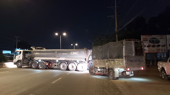 Các xe tải được đưa ra giữa quốc lộ 51 để chặn đường bỏ chạy của các “quái xế”. Ảnh: Thanh Niên