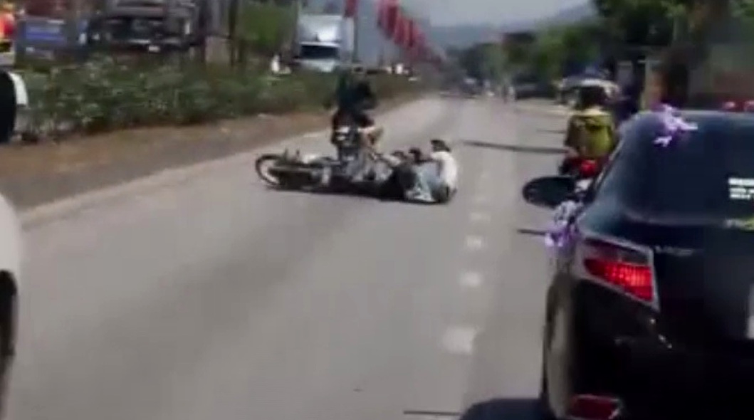 Chiếc xe máy bị ngã xuống đường - (ảnh cắt từ clip).