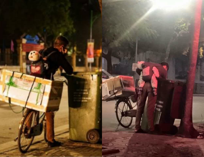 Những ngày cuối năm 2015, cộng đồng mạng xôn xao trước hoàn cảnh của ông bố địu con đạp xe đi nhặt rác vào ban đêm.