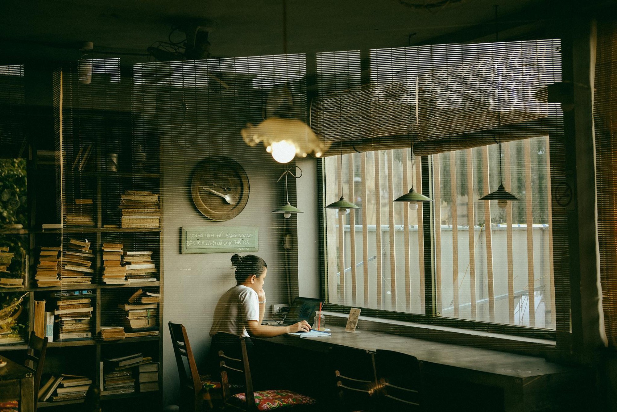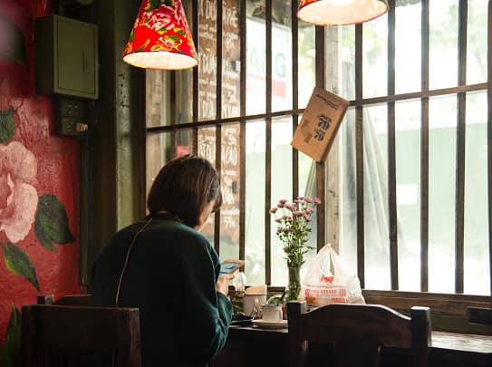 Hình ảnh cô gái đang ngồi ở Cộng cà phê