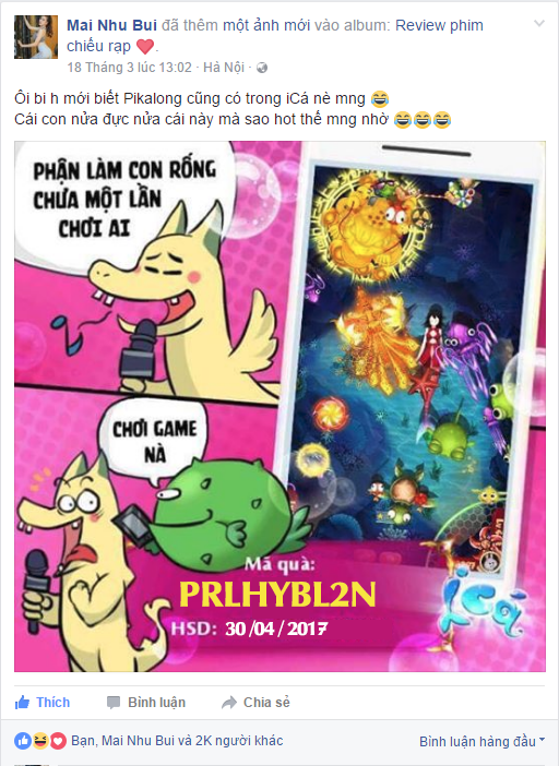 Sau vài ngày ra mắt, những hình ảnh này của iCá nhanh chóng khiến người chơi thích thú hưởng ứng. Rất nhiều bạn trẻ đã share lại trên mạng xã hội để “ủng hộ” người bạn Pikalong mà họ từng rất yêu mến. Hot girl Mai Thỏ (Bùi Như Mai) cũng tham gia tích cực trào lưu này.